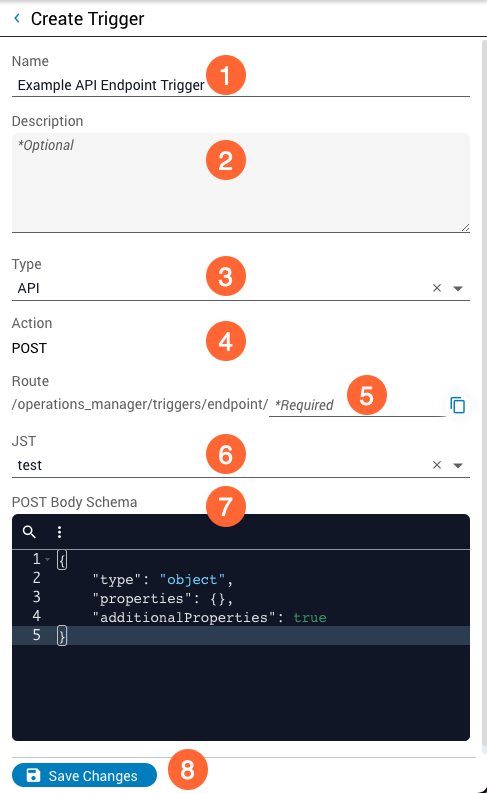 HTTP POSTrequest (represented as a JSON object) is validated against the POST body schema defined in the trigger. - If the body is validated, it is sent to an optional JST defined in the trigger.