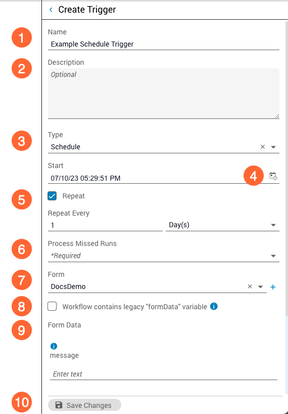 The Start time selected in the Create Trigger panel and shown in the trigger card after saving is based on your current time and date.
