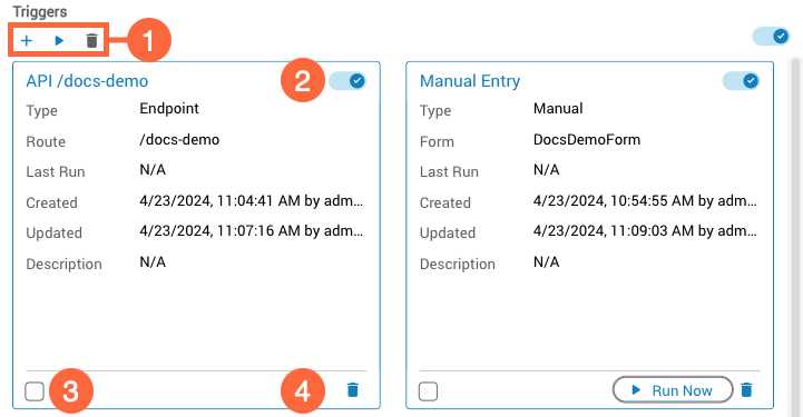 To run or delete a trigger, click the Run or Delete button at the bottom-right corner of the trigger card.