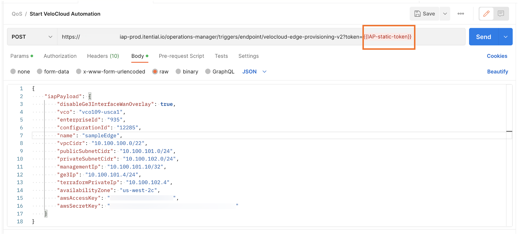 Payload body — The values in the payload body are used by the automation for edge provisioning in Velocloud: