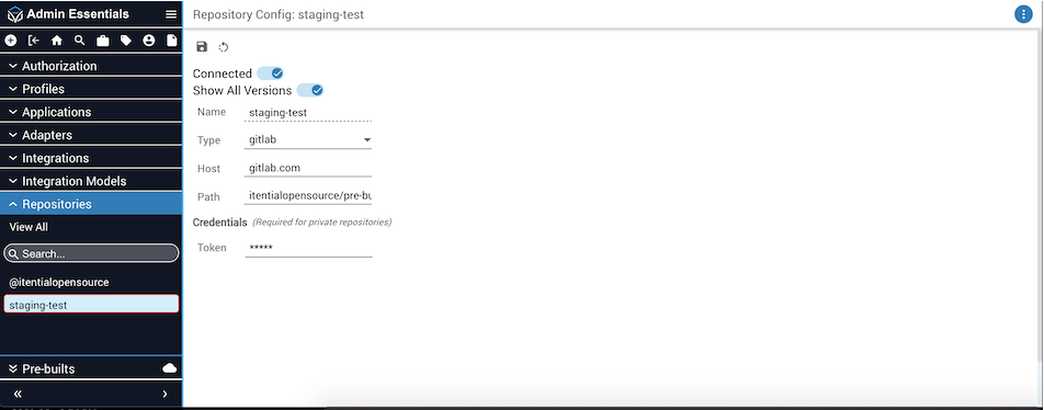 To connect or disconnect an existing repository configuration, go to the Repositories menu item of the Pre-built section of Admin Essentials and select the target configuration. A dialog will appear with all of the existing properties for the selected repository configuration. At the top of the dialog there is a toggle that can be switched on or off, representing the repository configuration being connected or disconnected.
