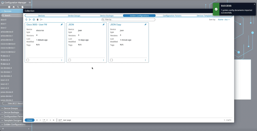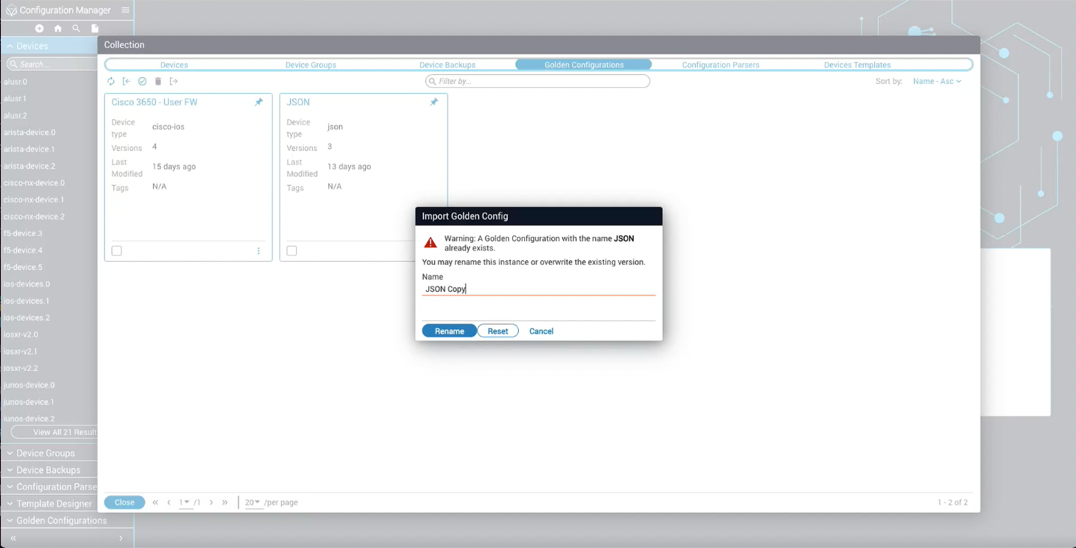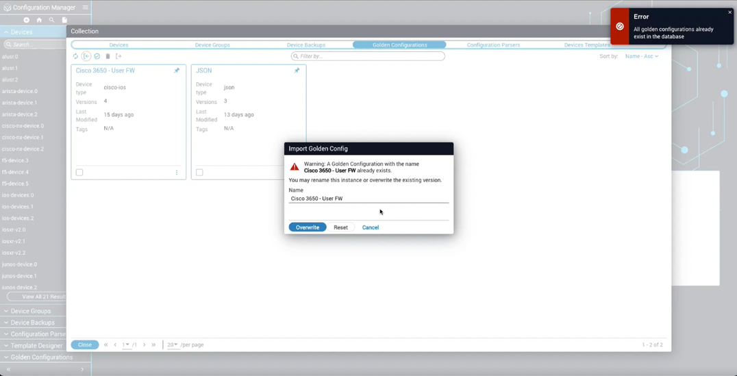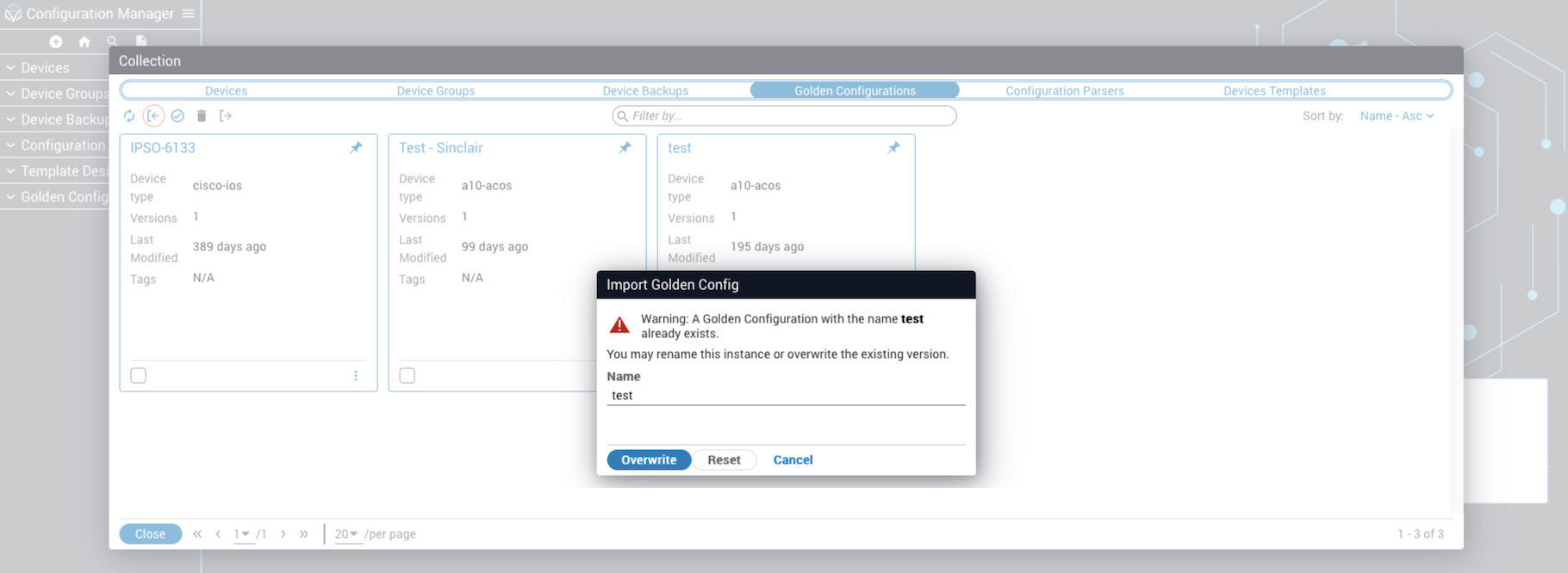 Previously in the Itential Platform, if a Golden Configuration with the same name already existed and you attempted to import a new one, you would get an error. This limitation is now removed in the UI, thereby enabling you to manage Golden Configs in Configuration Manager through a set of actions that will enhance how you handle the standard by which your devices should be configured.