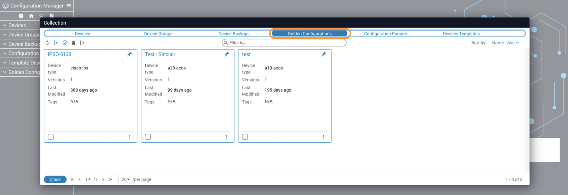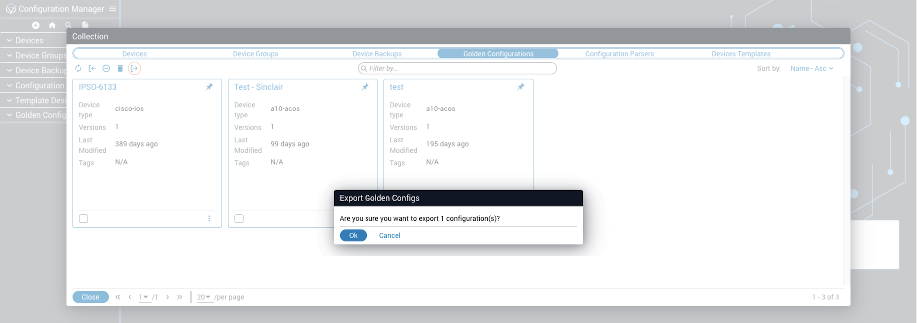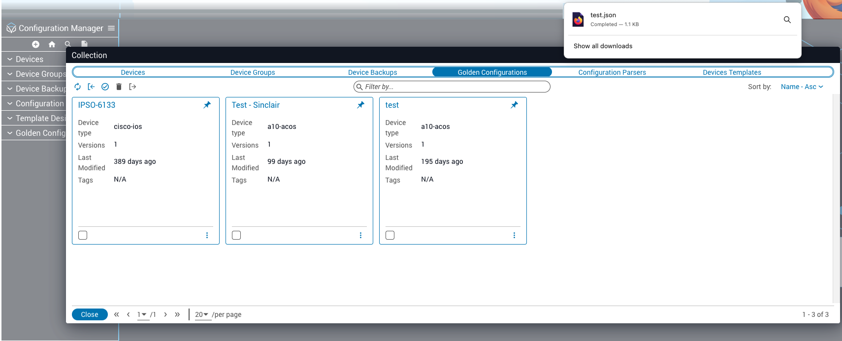 Previously in the Itential Platform, if a Golden Configuration with the same name already existed and you attempted to import a new one, you would get an error. This limitation is now removed in the UI, thereby enabling you to manage Golden Configs in Configuration Manager through a set of actions that will enhance how you handle the standard by which your devices should be configured.