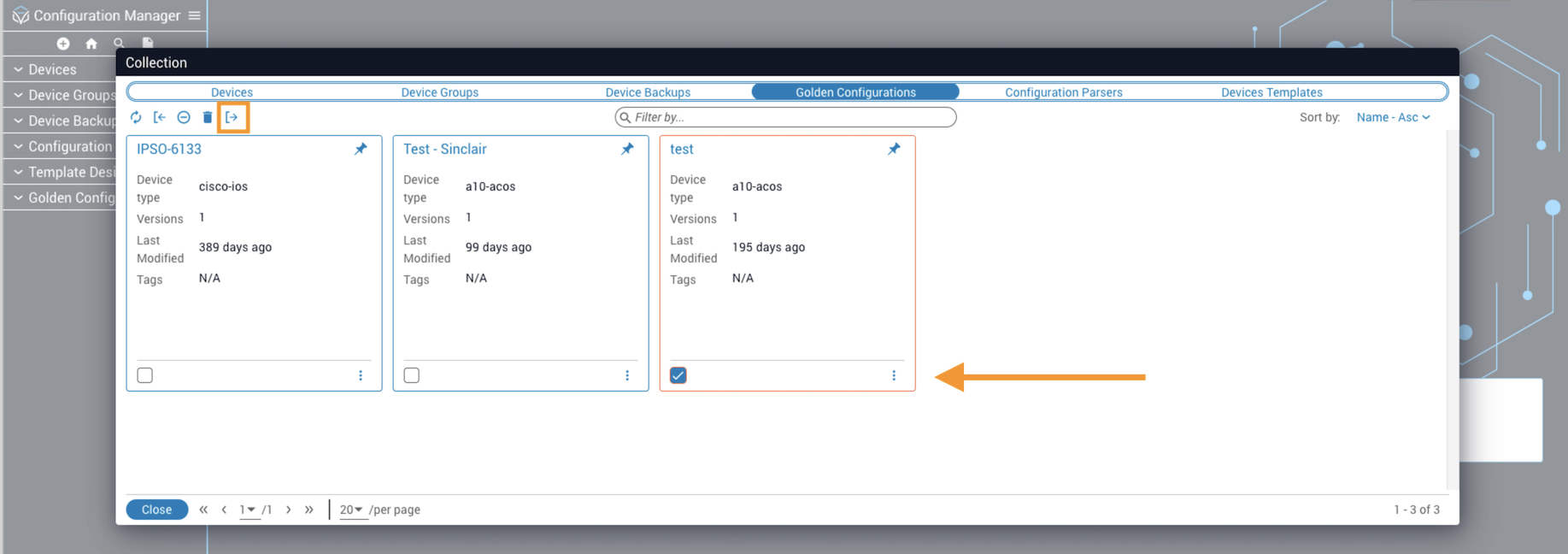 Select the checkbox at the bottom of each Golden Configuration you want to export and then click the Export icon (upper-left).