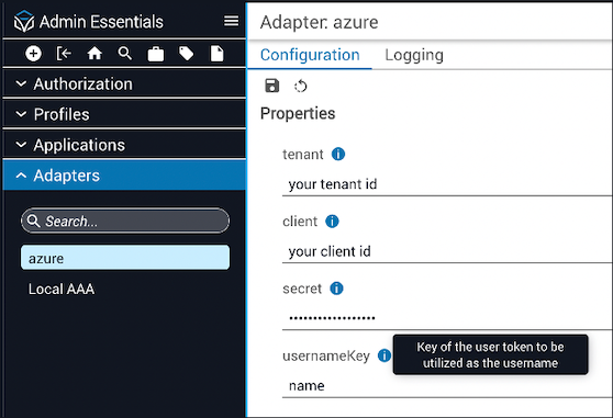 To configure the usernameKey field, navigate to Admin Essentials. Use the search bar in the left sidebar to locate “Azure” in the Adapters menu list. Under the Configuration tab on the Properties page, enter a specific claim in the usernameKey field.