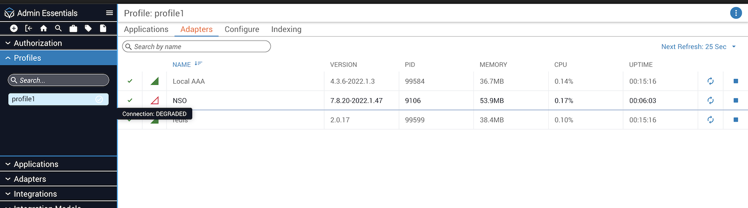 Check the connection status from Admin Essentials → Profiles → Adapters. Status should show as “Running” and connection as “Online”.
