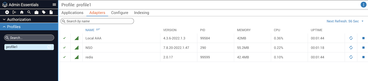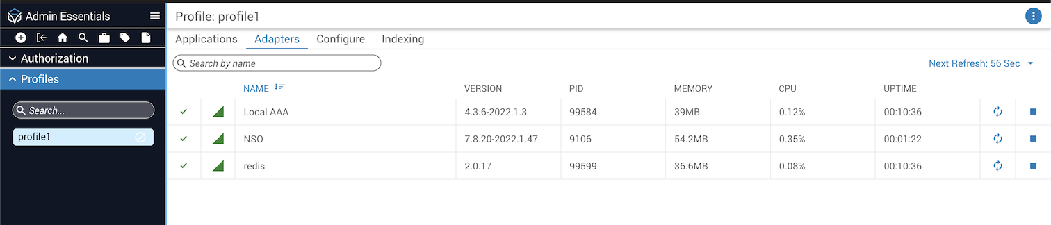 Go back and check the connection status from Admin Essentials → Profiles → Adapters. Status should show as “Running” and connection as “Online”.