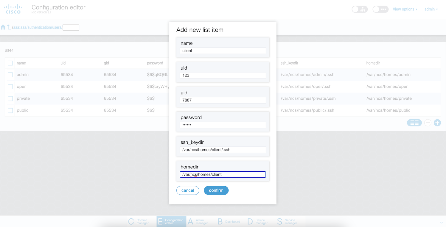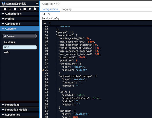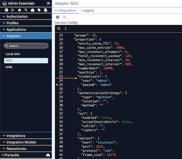 Change the Adapter NSO properties credentials to the newly created user (username and password).