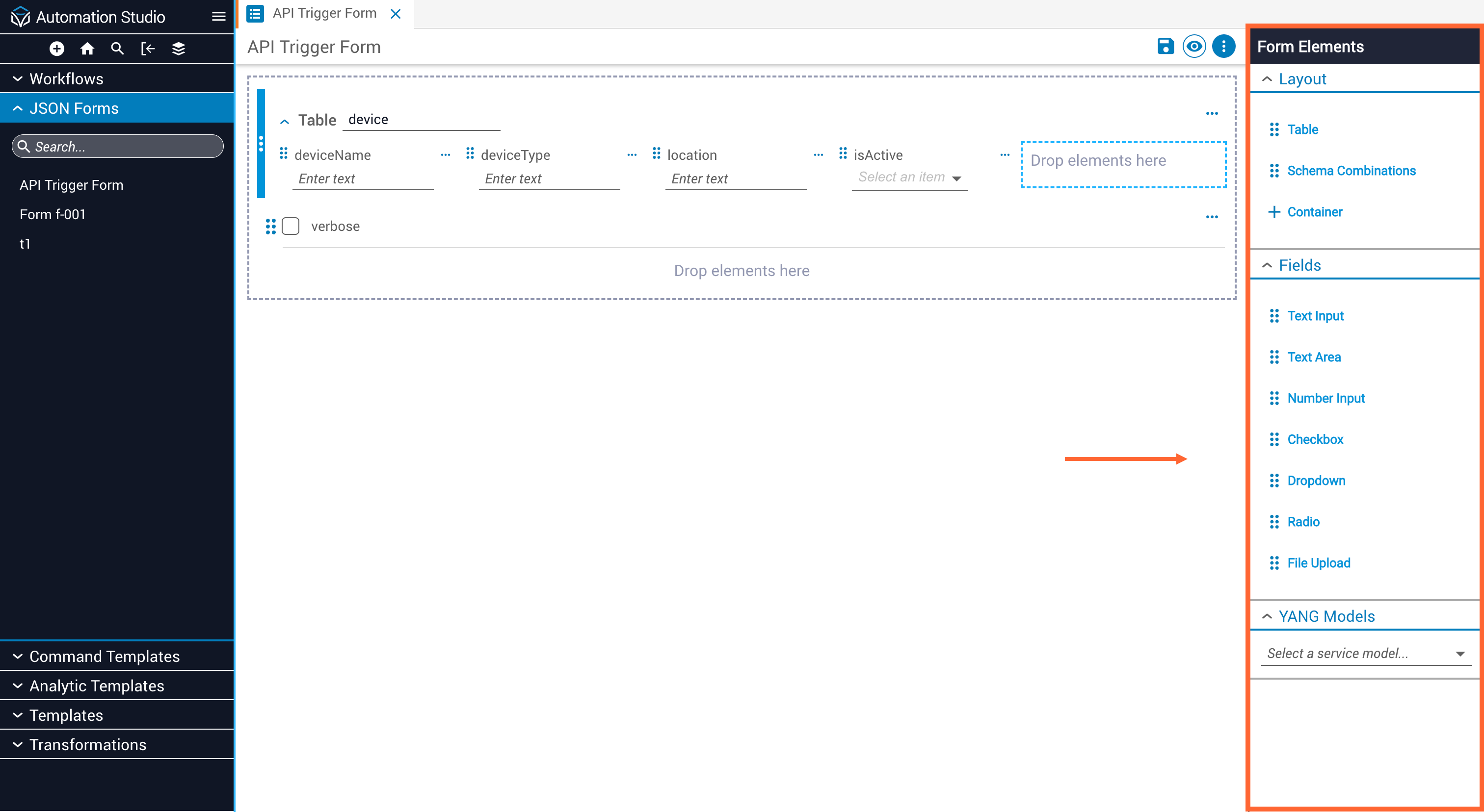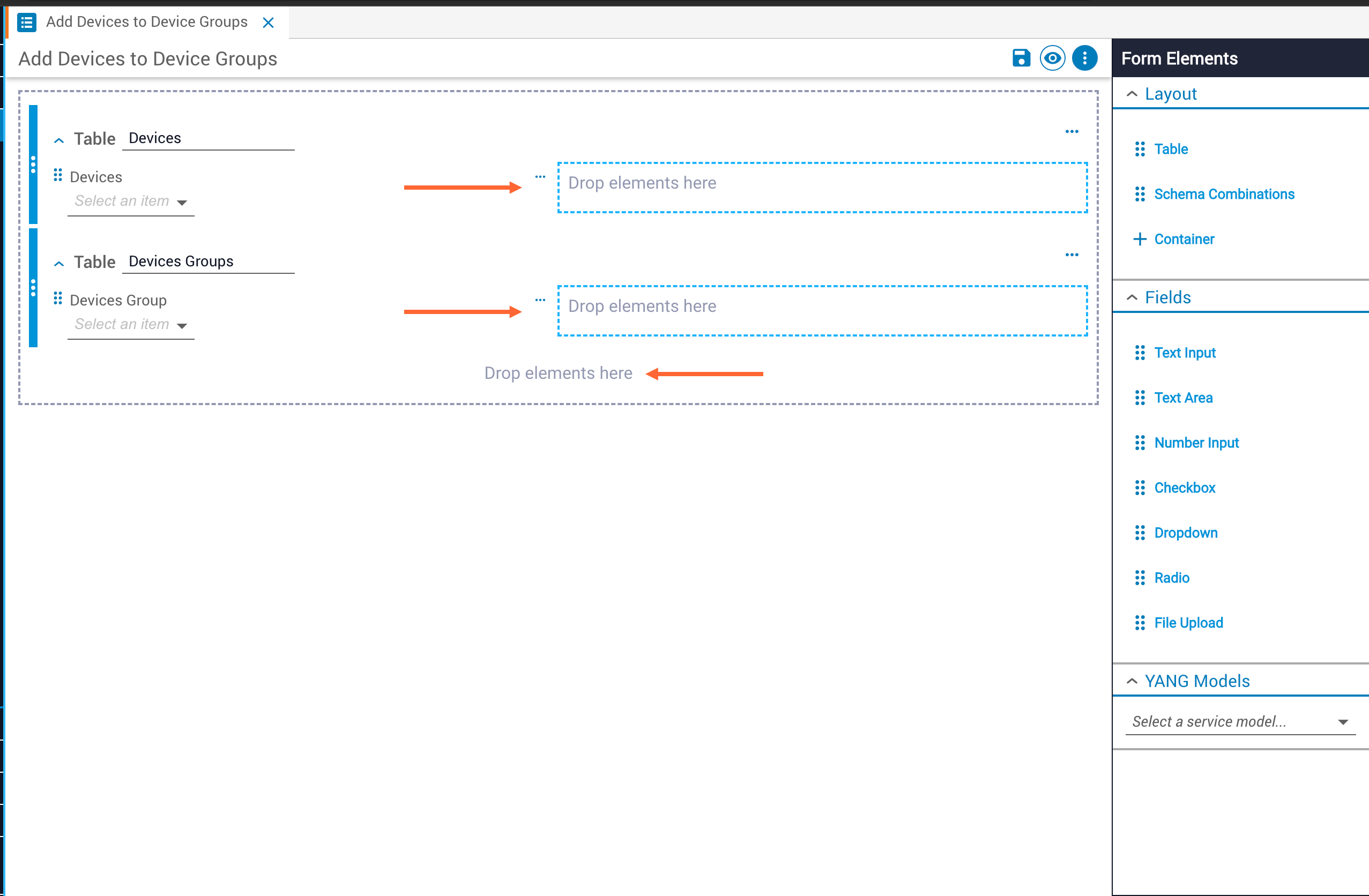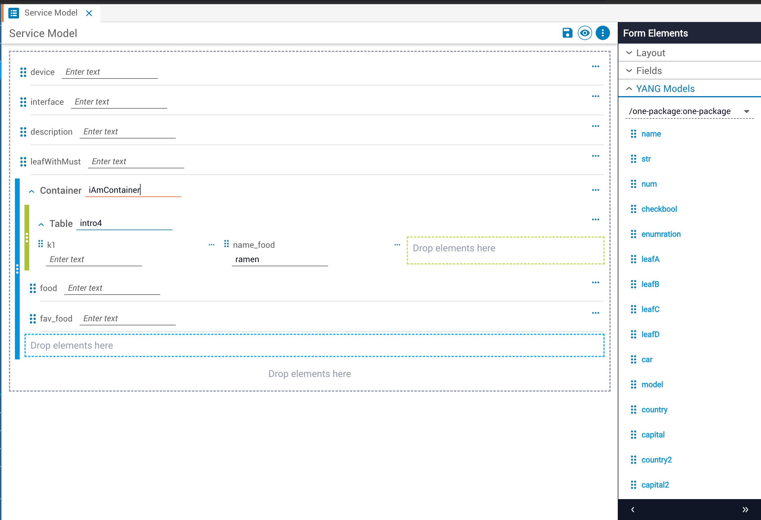 YANG lists become tables in JSON Forms. YANG containers become containers. All child elements are included when the parent is dropped onto the canvas.