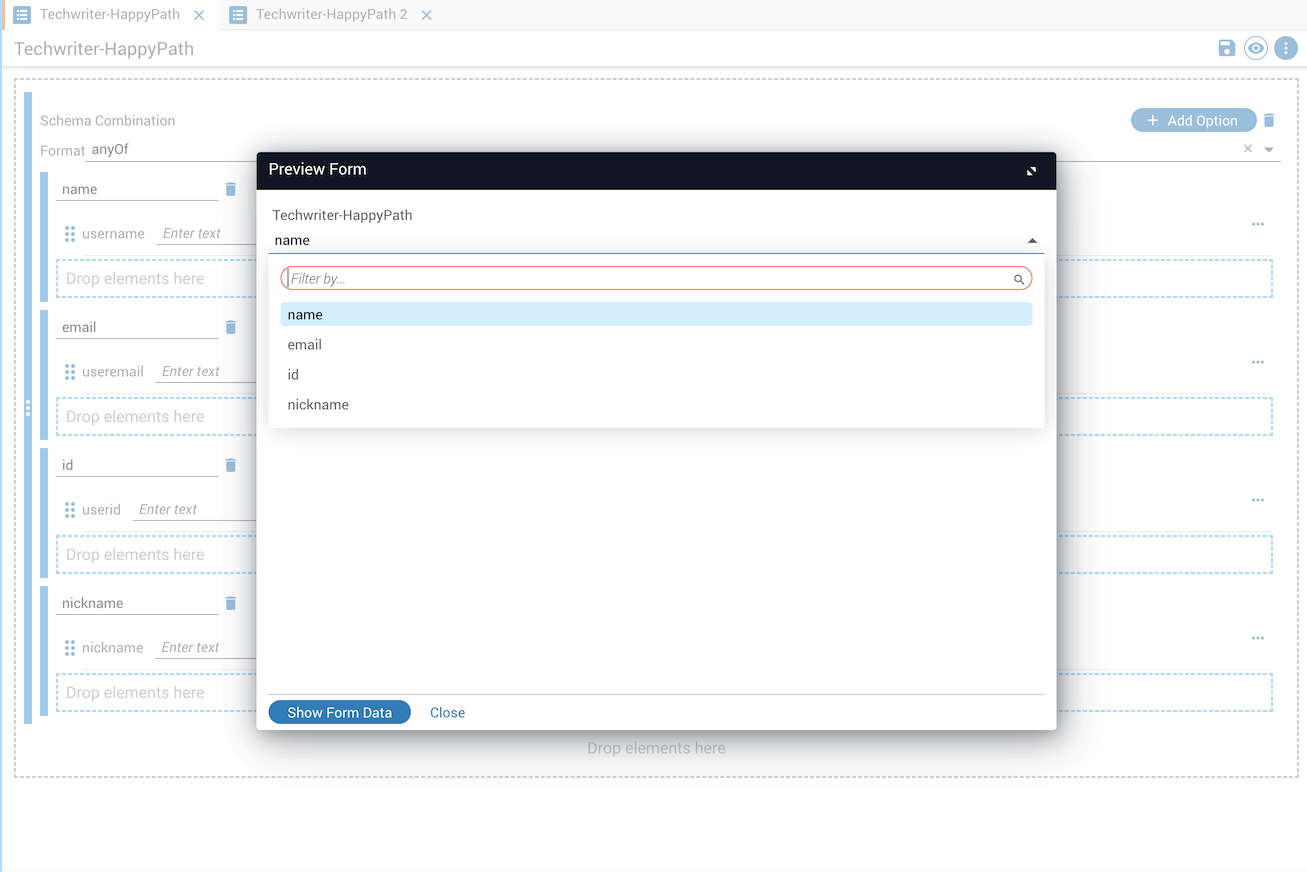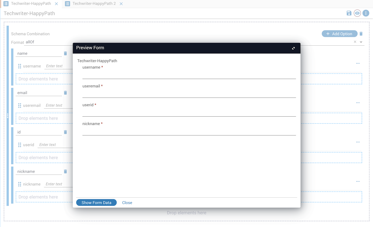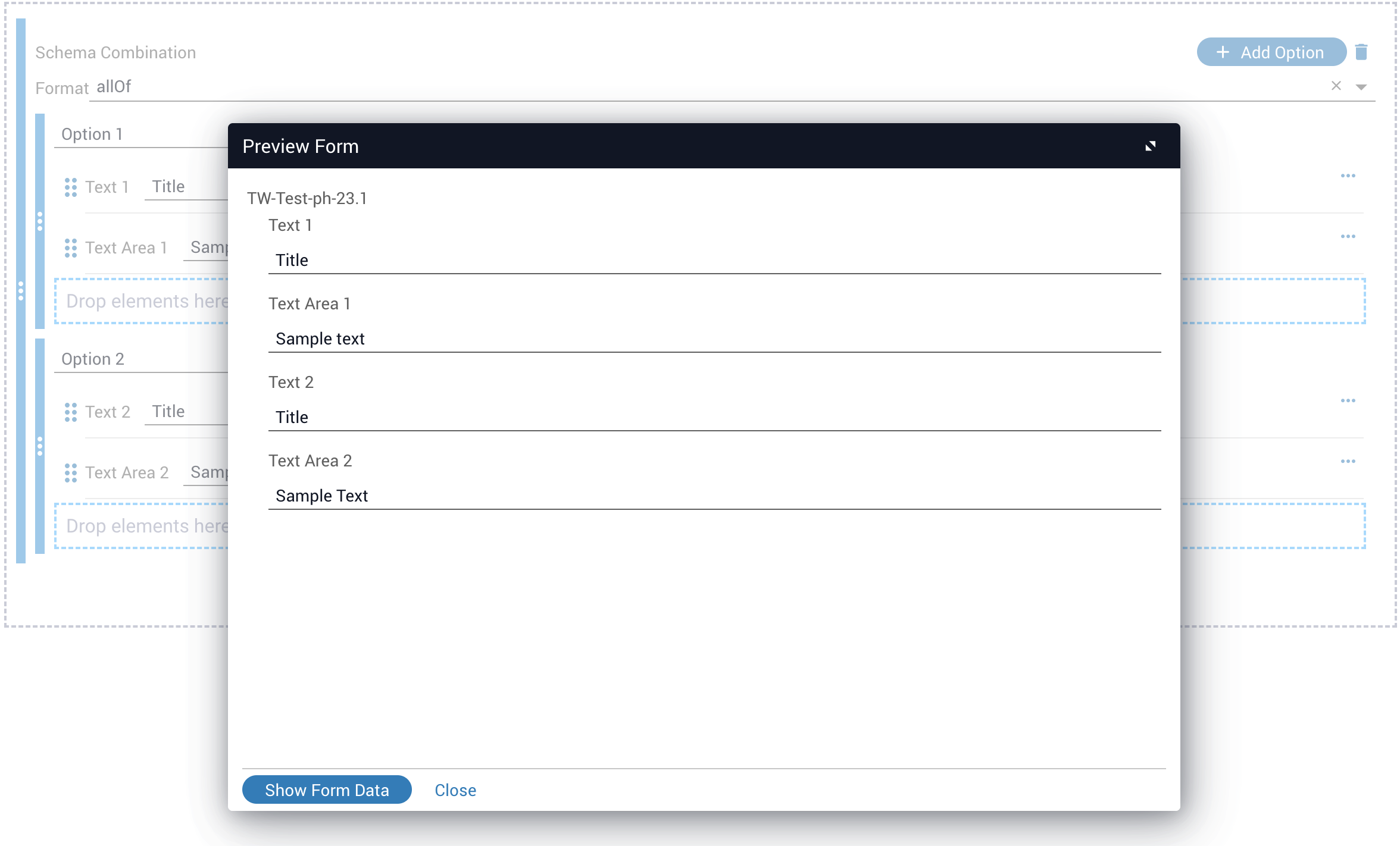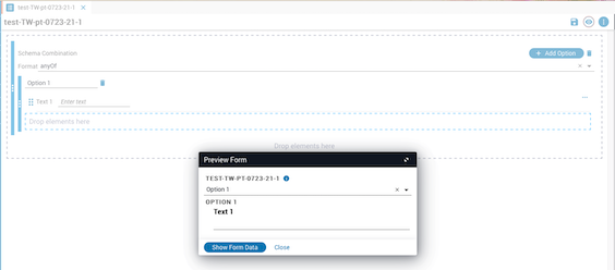 In the preview footer, click Show Form Data to display the JSON Schema, UI Schema, Binding Schema, Validation Schema, and other schema inputs. Click Show Form to return to the preview.