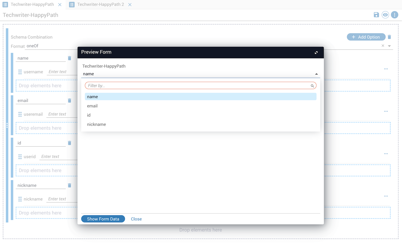 When filling out the form, the element renders a dropdown for selecting an option. The corresponding sub-schema is then shown.