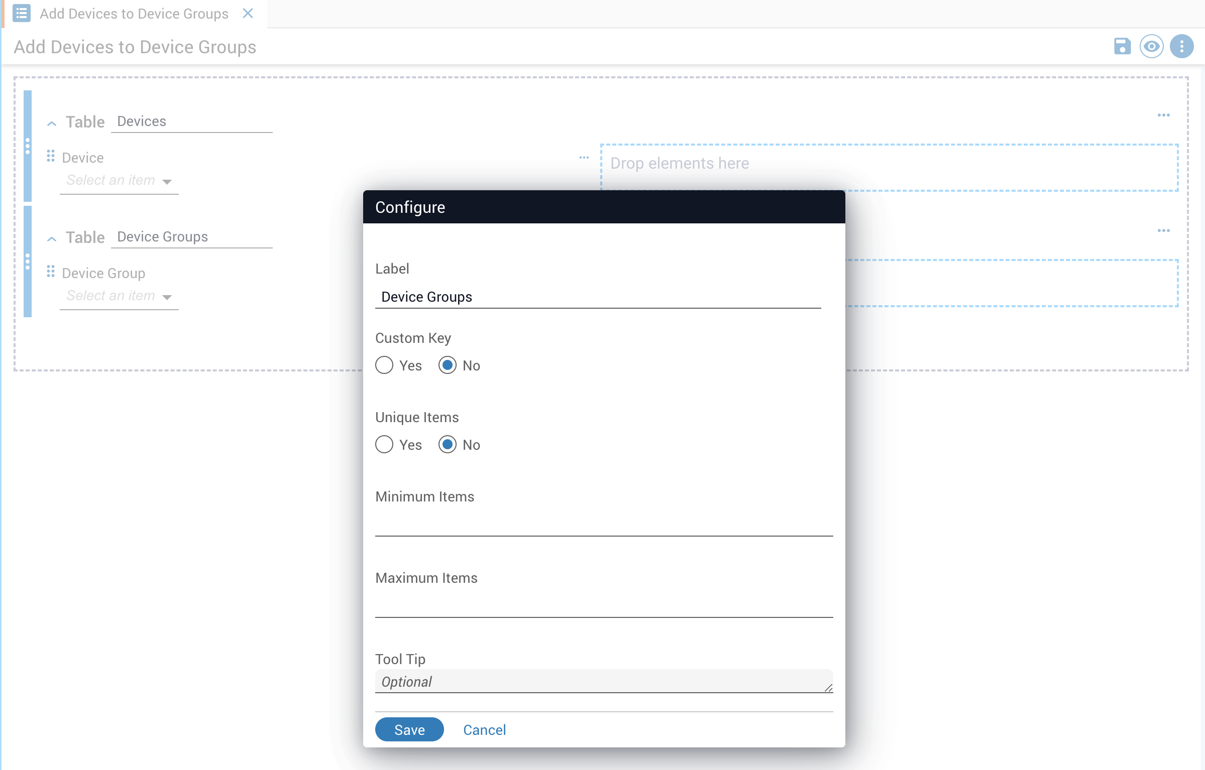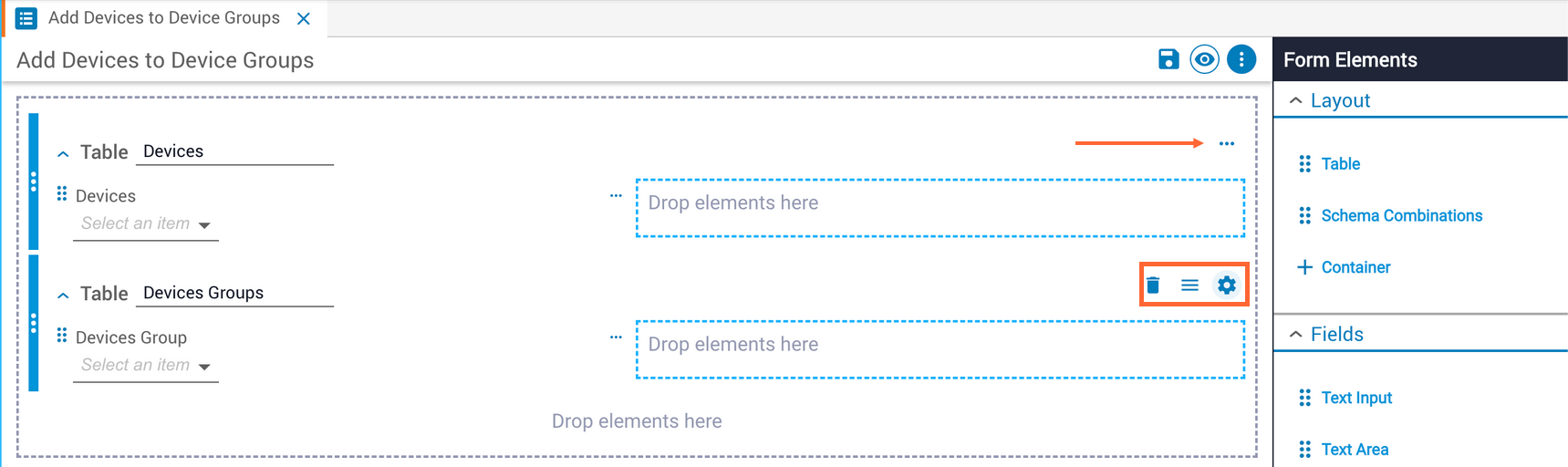 - Tables — Group elements into repeatable rows. Each element added to a table becomes a column. When the form renders, users can add rows made up of those sub-elements.