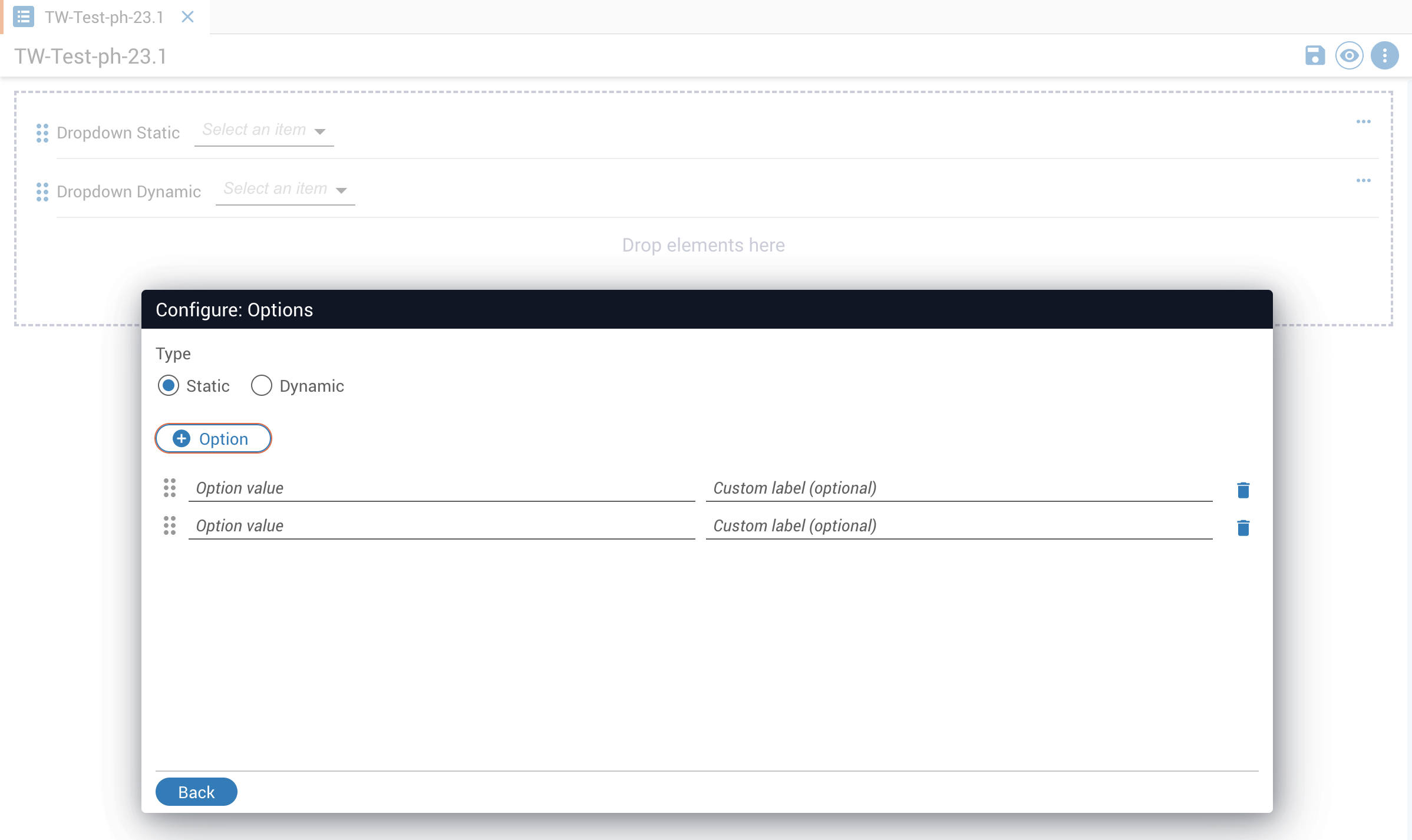 Set the options type to Static. Click + Option to add items, then enter a value for each. Use the drag handle to reorder items and the trashcan icon to remove them.