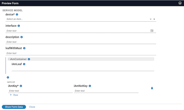 JSON Forms replicates YANG xpath-based behavior in the UI. Leafref-defined data references render as dropdowns. when expressions control conditional field rendering. Validations run on form submission.