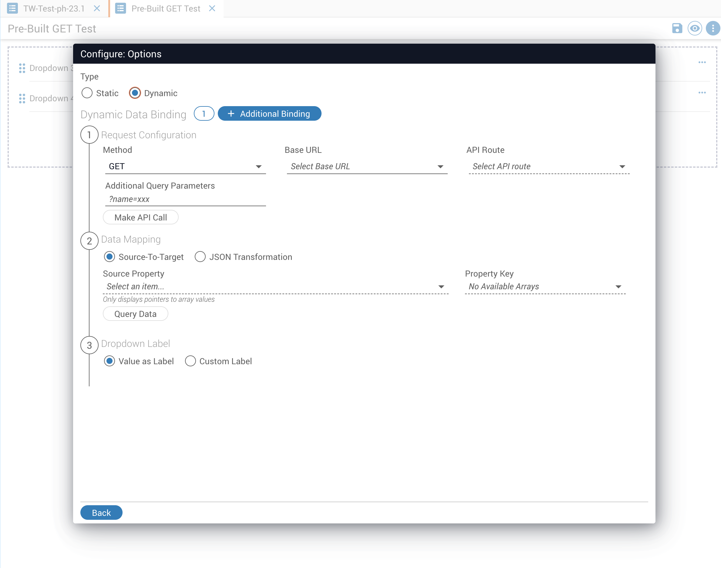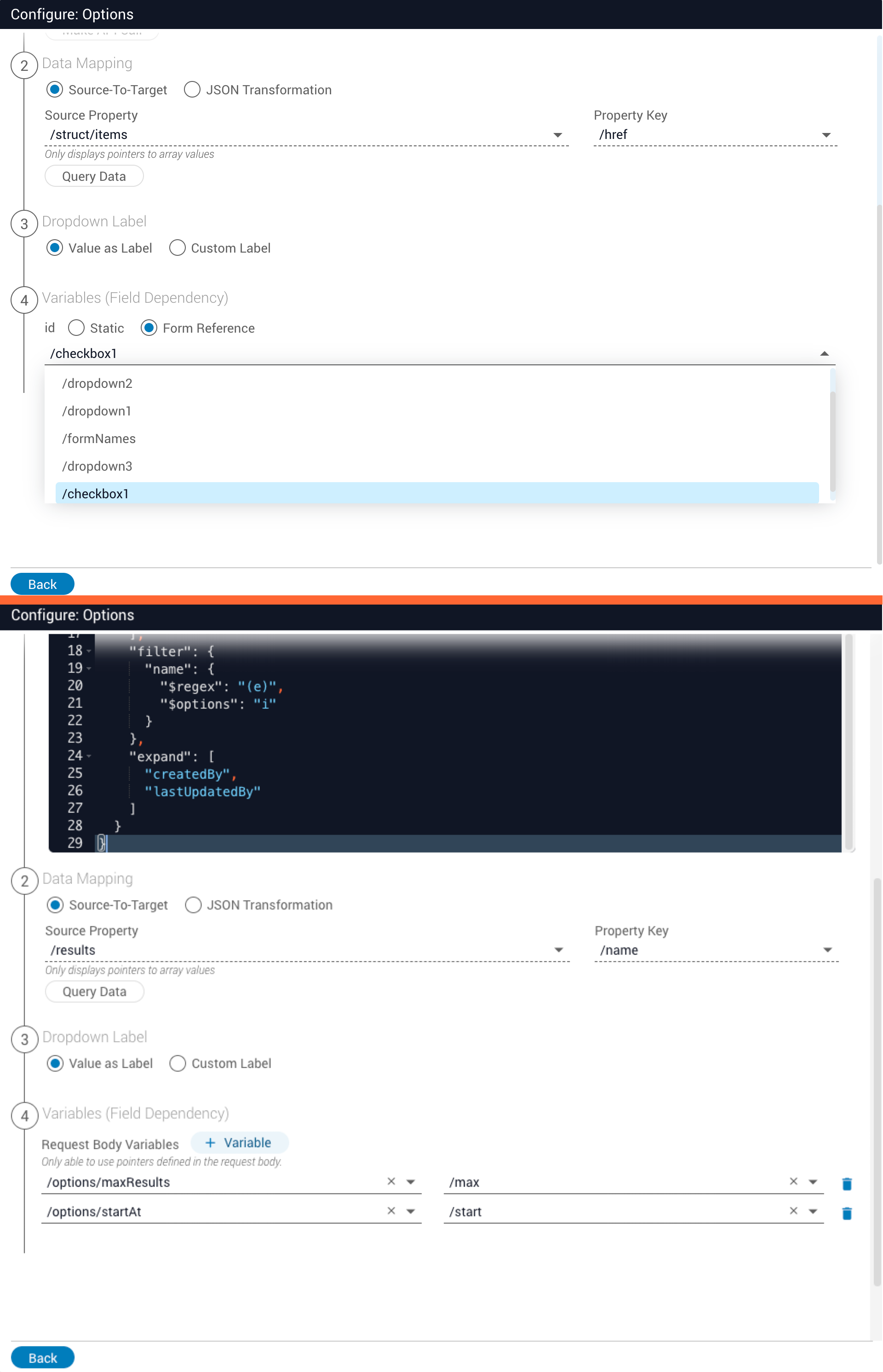Parts of a dynamic dropdown’s API request can source their values from other fields in the form. These are called field dependencies. Their behavior depends on the request method: