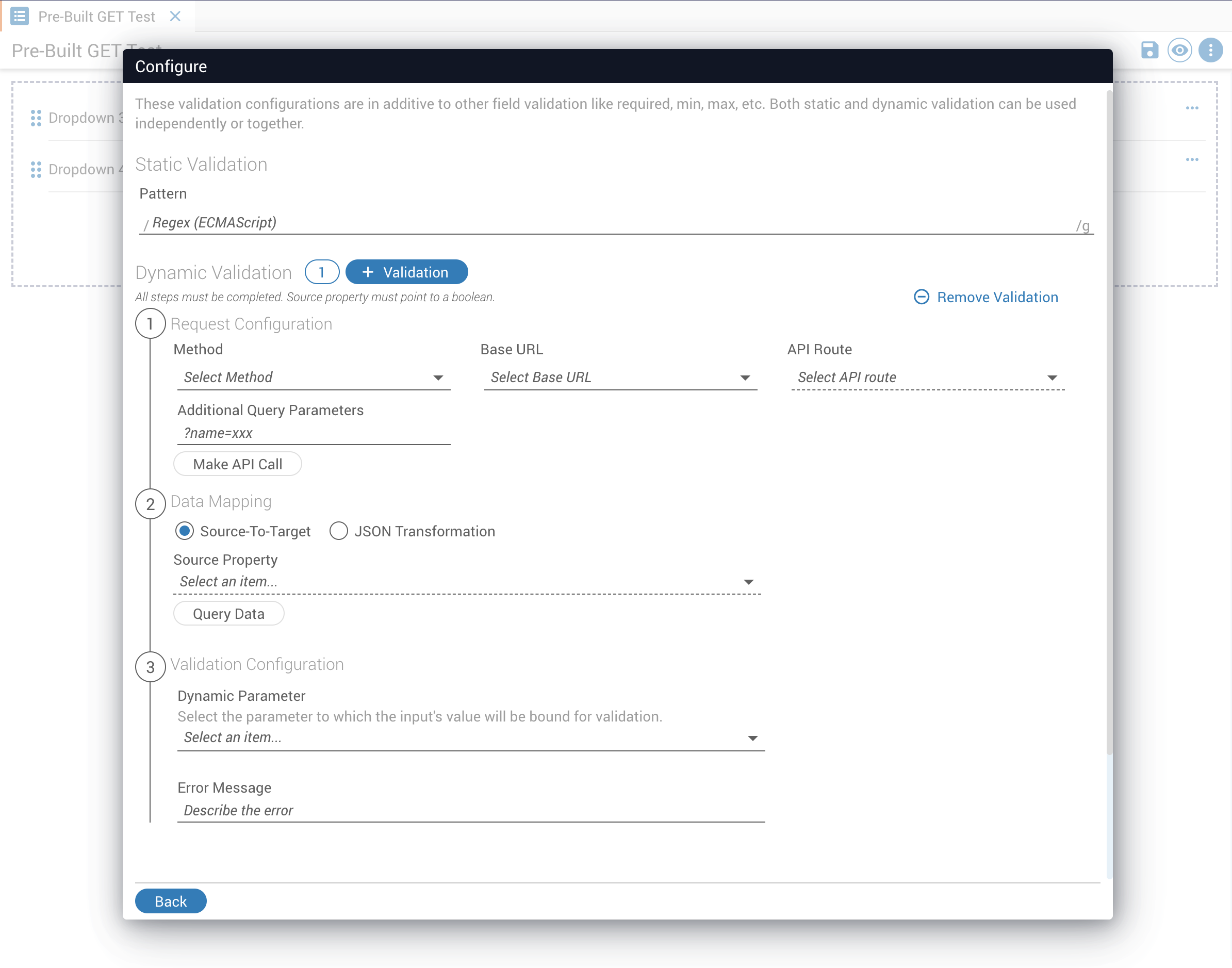 Click + Validation on a form element to add pattern validation, dynamic validation, or both.