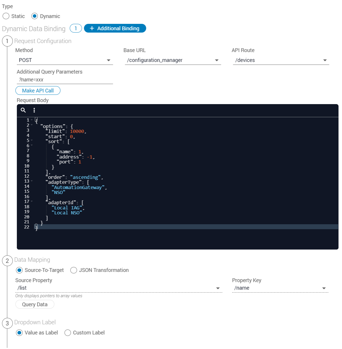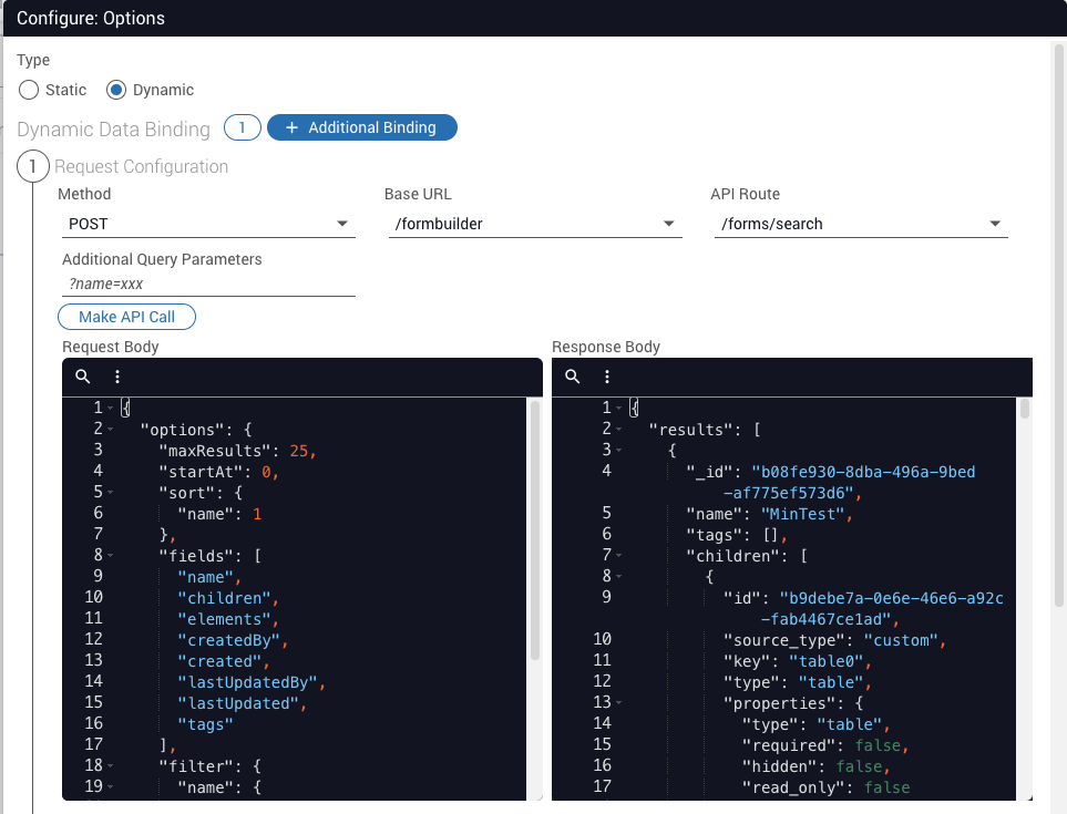 Click + Options and select Dynamic. The Dynamic Data Binding options appear.