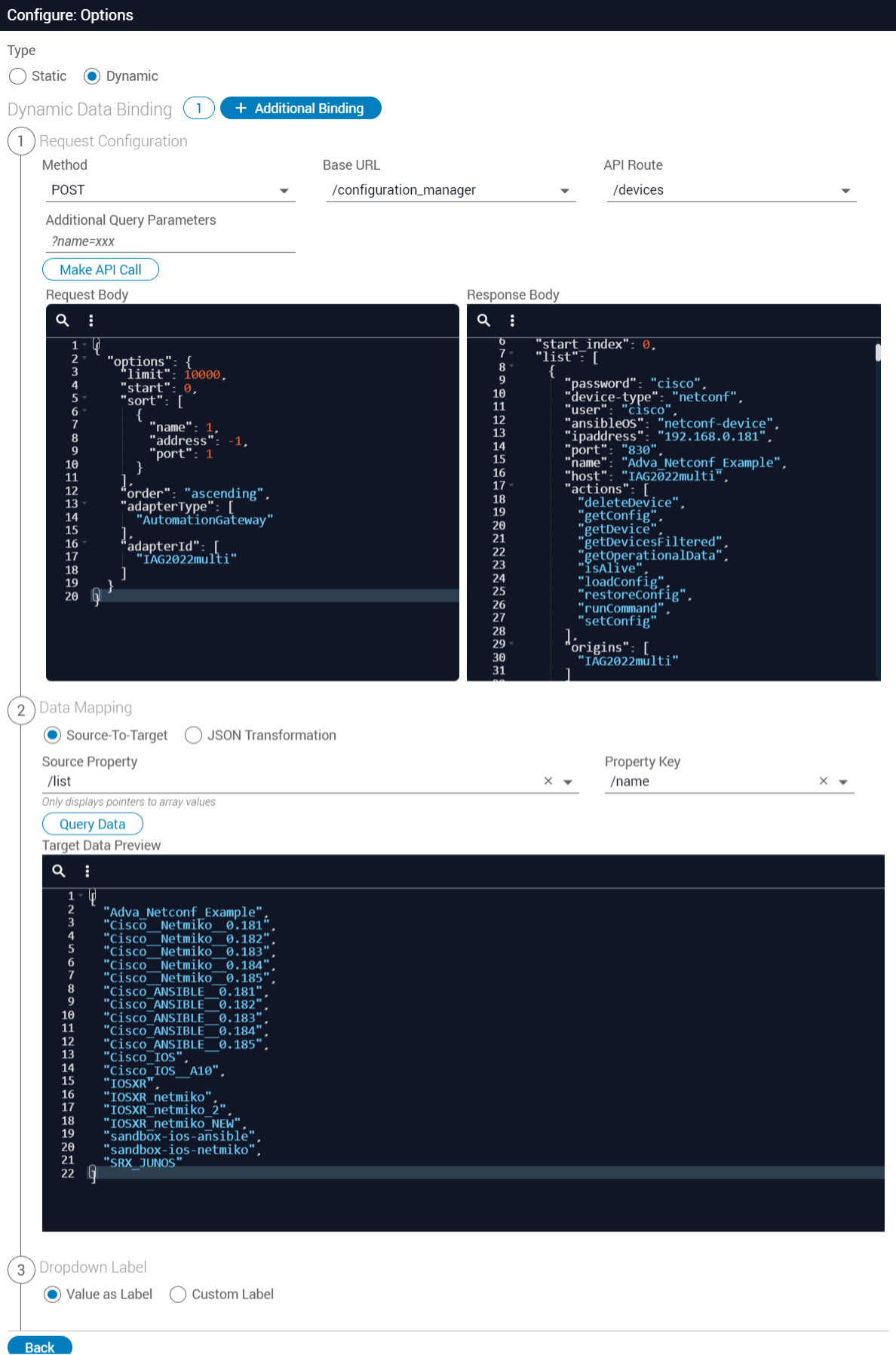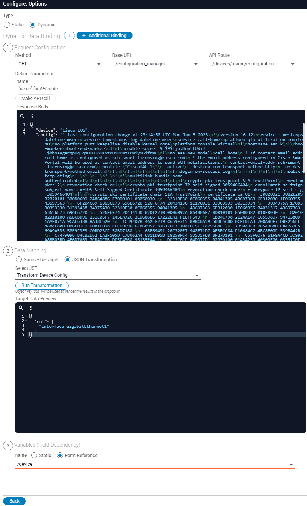 A Device dropdown populates from Configuration Manager. Selecting a device causes an Interface dropdown to fetch and display only that device’s interfaces (GET request with a route parameter dependency).