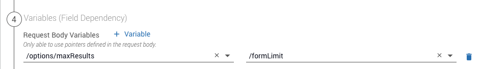 Field dependencies are configured on the dependent field’s dynamic dropdown, under Variables (Field Dependency). The source field is referenced by its JSON schema path (for example, /device). When using GET requests, the dependency replaces a route parameter. When using POST requests, it replaces a property in the request body.