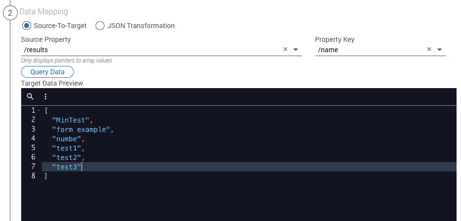 Under Data Mapping, select JSON Transformation and enter the “Transform Device Config” JST file provided below. Click Run Transformation. The Target Data Preview displays the interface name.