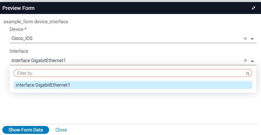 A common pattern is a cascading dropdown: a first dropdown selects an entity such as a device, and a second dropdown automatically populates with data specific to that entity such as that device’s interfaces. Another pattern is a constrained search: a number input controls a maxResults parameter, so the form operator directly determines how many results a dropdown retrieves.