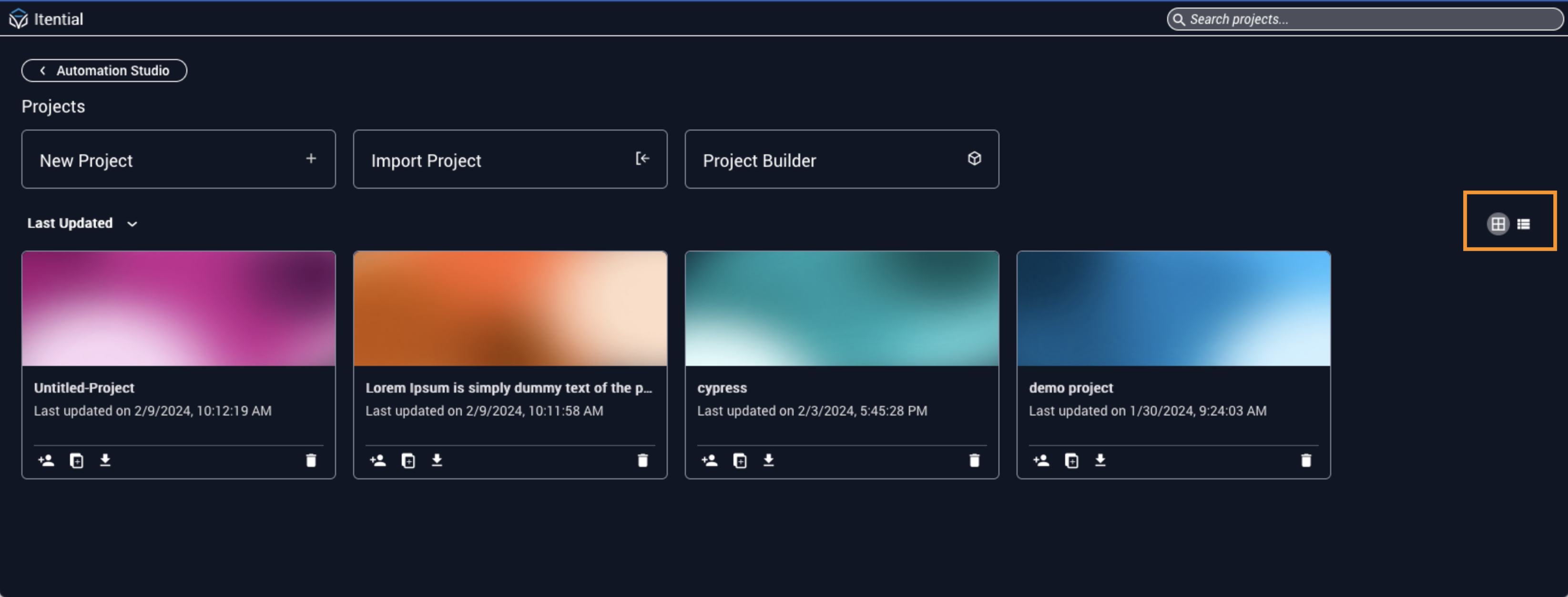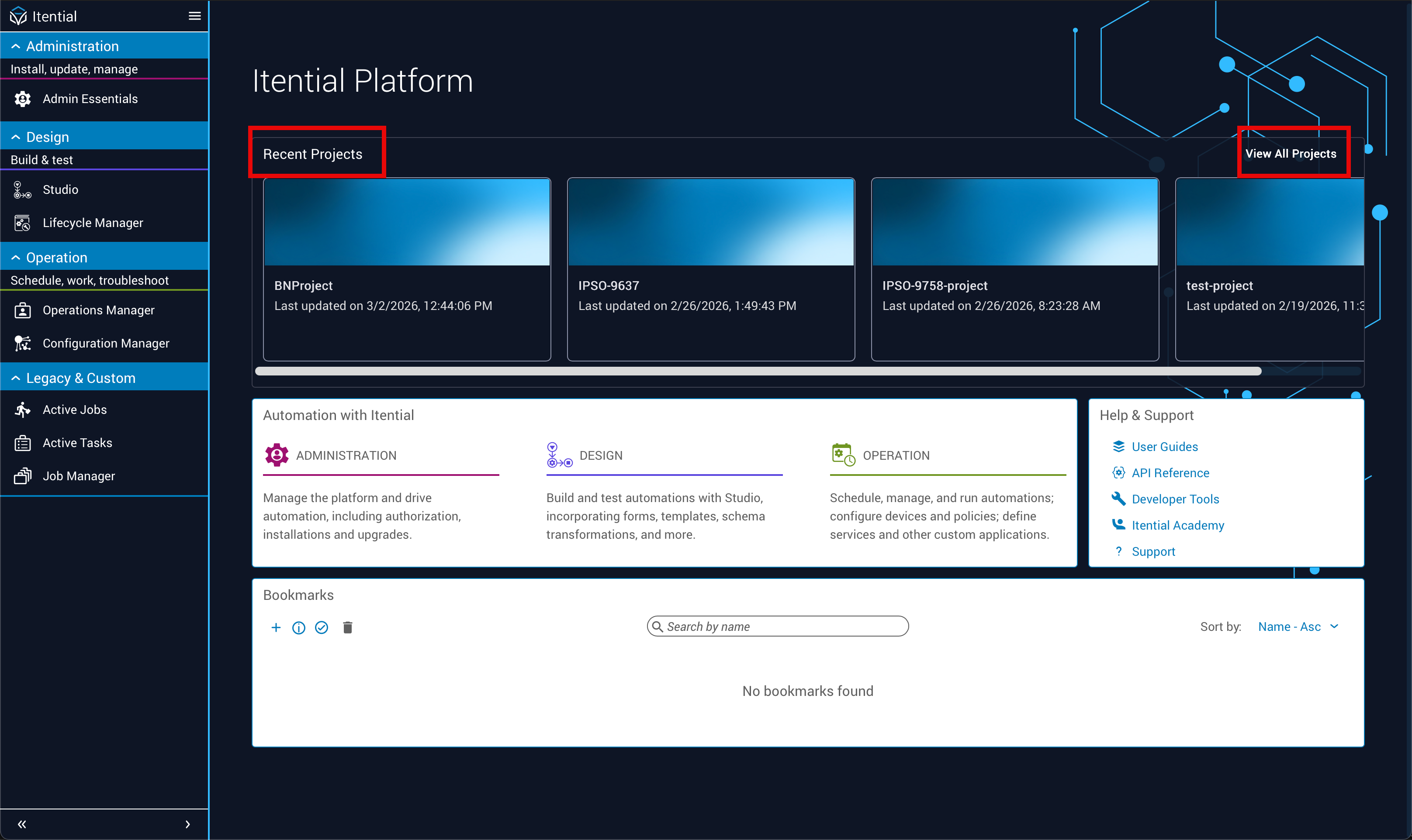 Recent Proprojectsjects section on the Itential Platform homepage -