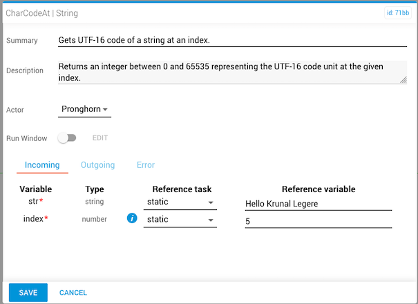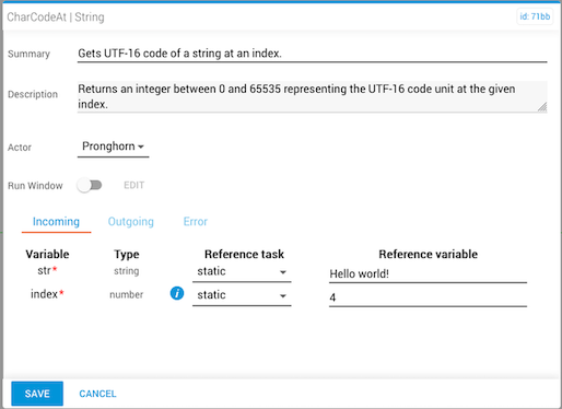 The charCodeAt task obtains a Unicode decimal value (UTF-16) for a character at a specific position in a string. UTF-16 is a 16-bit integer between 0 and 65535.