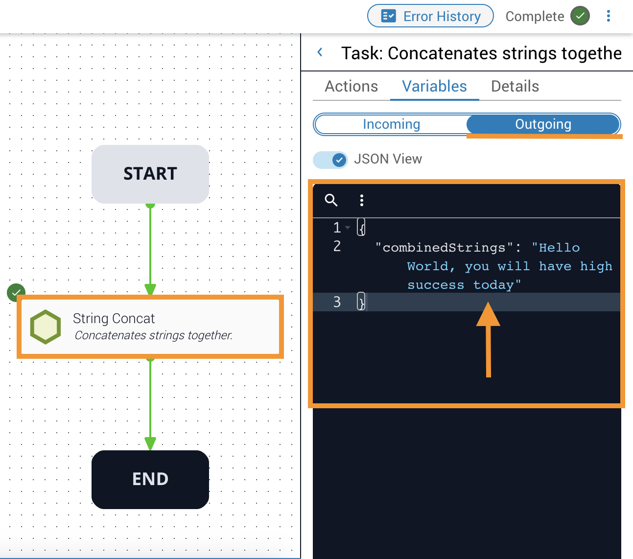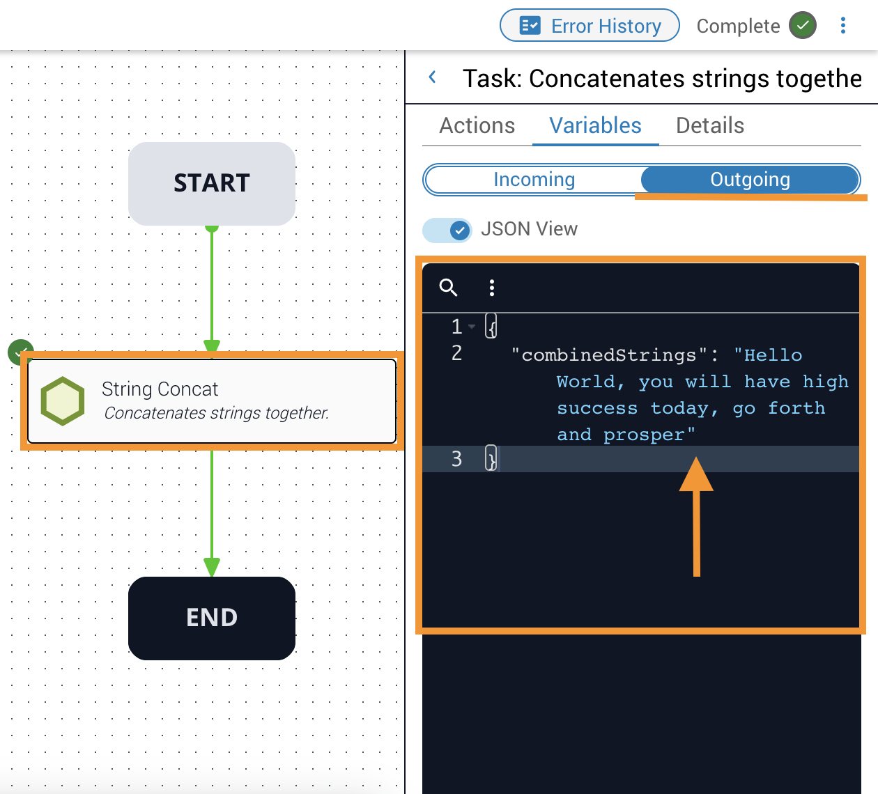 stringNarray is populated with two items enclosed in square brackets:you will have high success todayandgo forth and prosper. The punctuation is used for sentence structure and is not required — the concatenation process does not add spaces or other characters between variables. - The outgoing