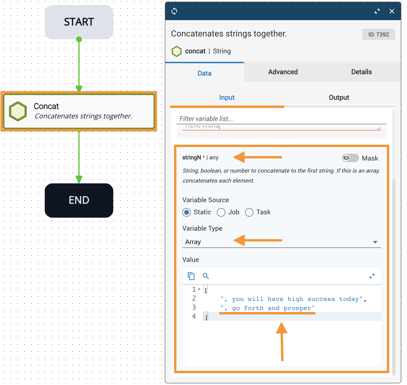 The concat task combines strings. It can concatenate strings or an array of strings consisting of one or more values. This task does not provide the ability to reorganize the array or iterate through it.