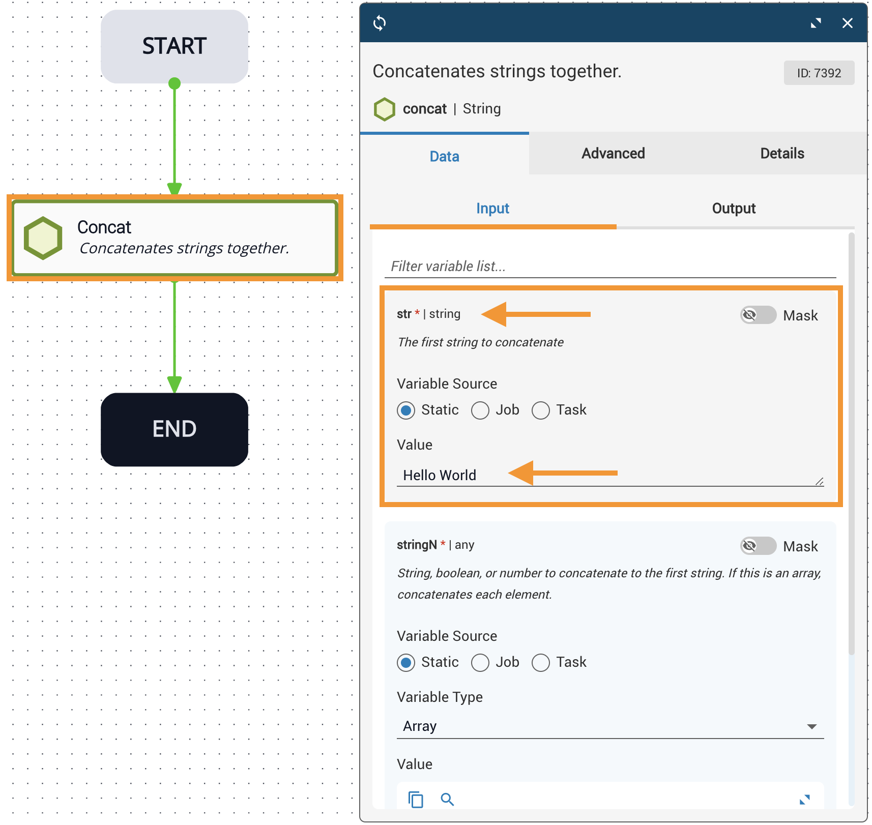 Use this task when you need to append one or more string values to the end of another string. The concatenated result returns a new string containing the combined strings. For example, if you have a notification message that needs to be appended, concat could be used to generate the new combined message.