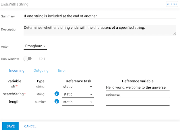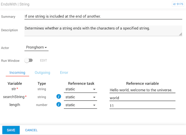 The endsWith task searches a given string to determine whether a specified sequence of characters appears at the end. You can also limit the number of characters searched. The task returns true if the string ends with the characters, or false if they are not found. The original string is not changed.