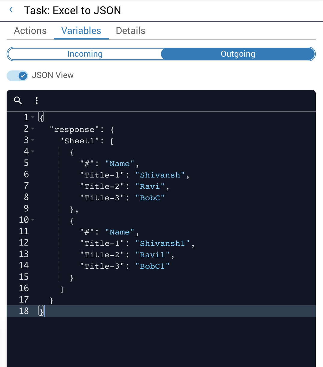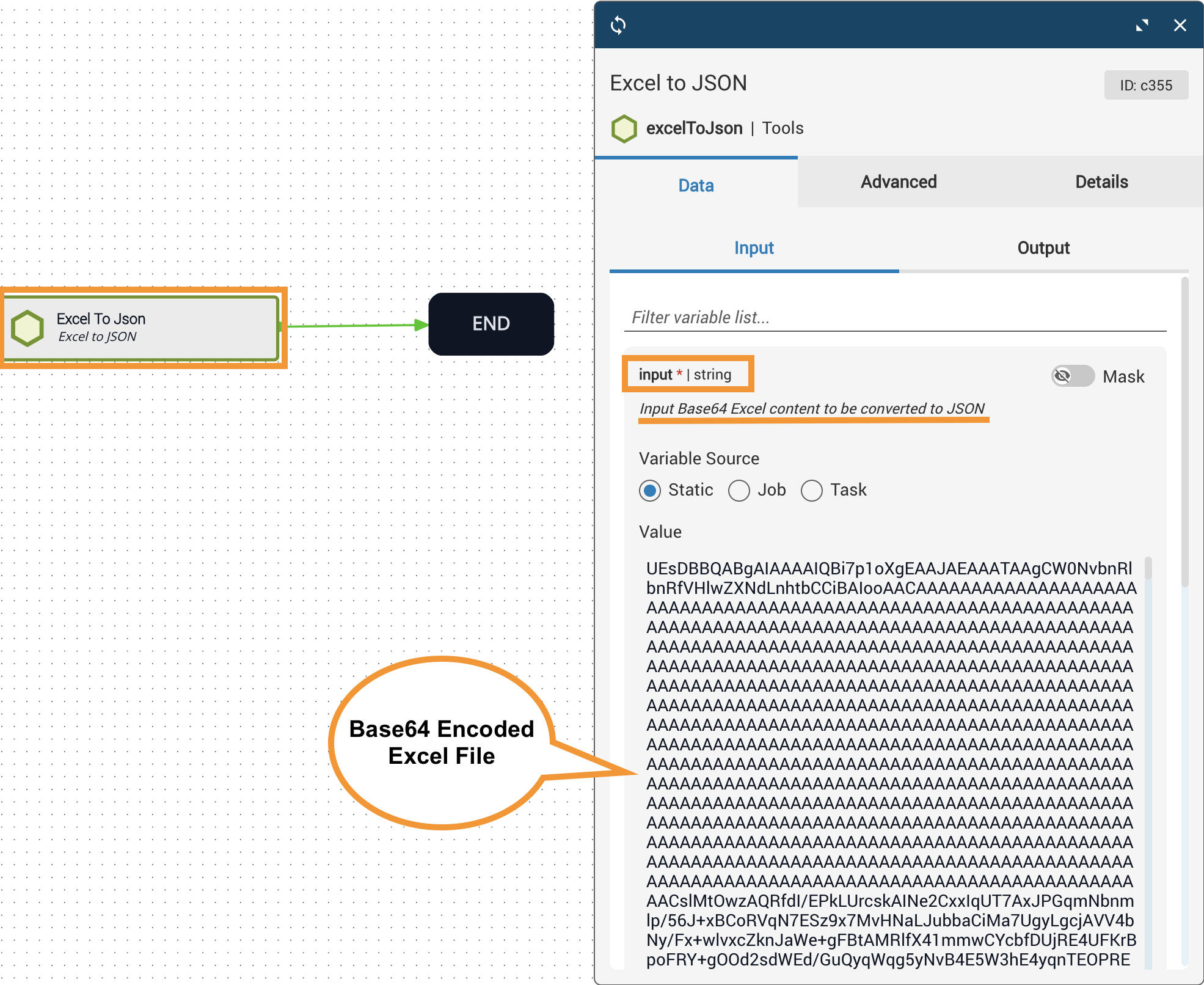 Suppose you are building a workflow and need to convert user inputs to JSON. Instead of filling out a JSON form to provide job variable inputs, you can upload a spreadsheet with the workflow input variables. After the spreadsheet values are converted to JSON with excelToJson, the variables can be queried from the output and used in further tasks.