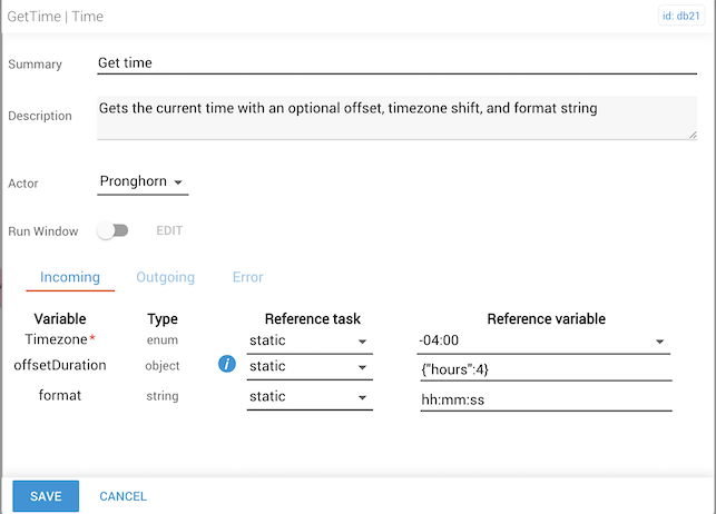 The getTime task obtains a current timestamp for use in other tasks in a workflow. An offset may be applied to the current timestamp if needed. The getTime task uses UTC for time representation.