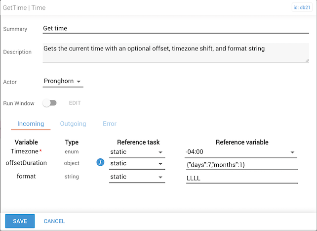 Use this task to post the current time in a logfile or external database when an automation starts or completes. Using an offsetDuration, you can also use this task to provide a future timestamp calculated from the current time.