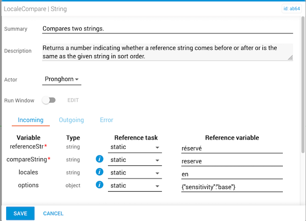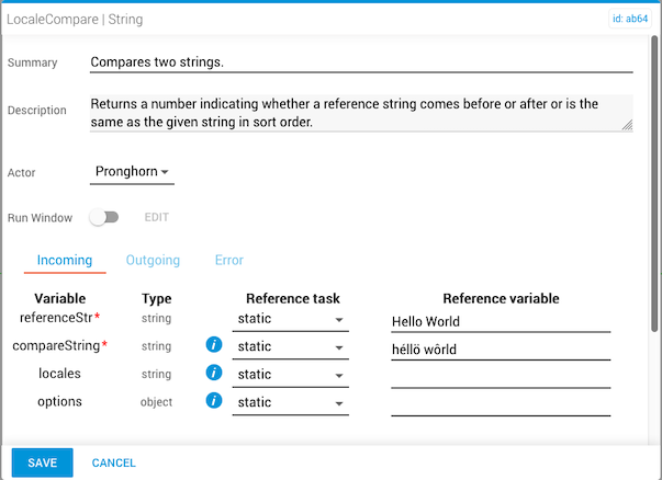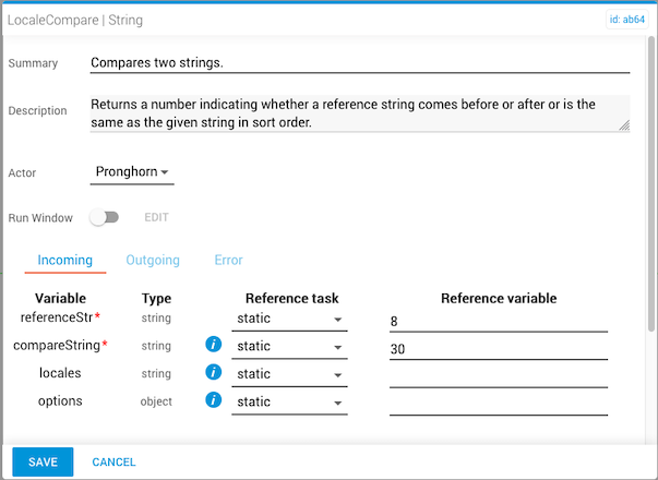 The localeCompare task compares two strings in the current locale and returns a numeric value (negative, zero, or positive) indicating whether the reference string comes before, after, or is the same as the compareString in sort order. The locale is based on the language settings of the browser.