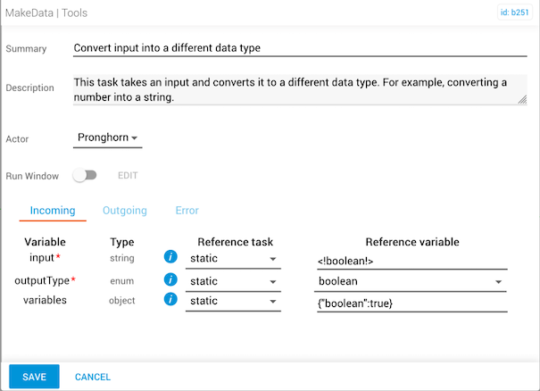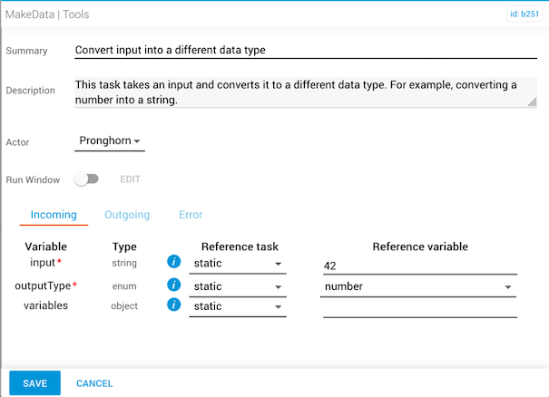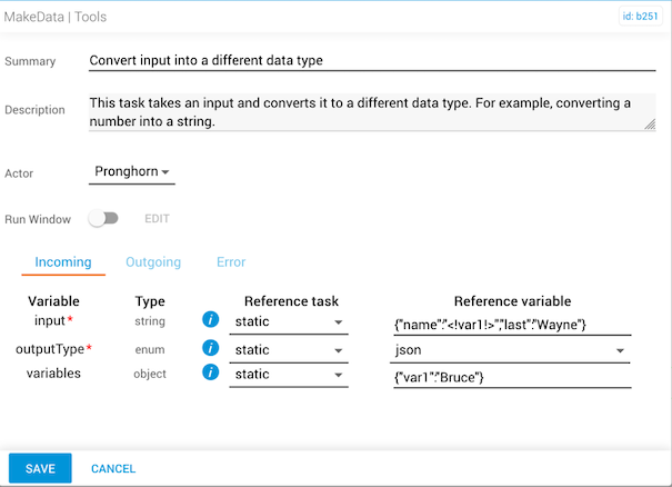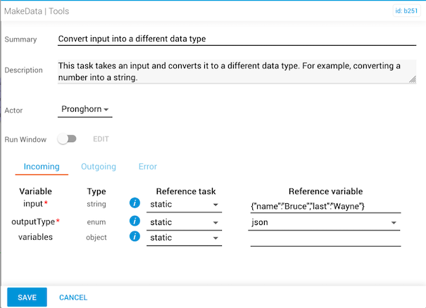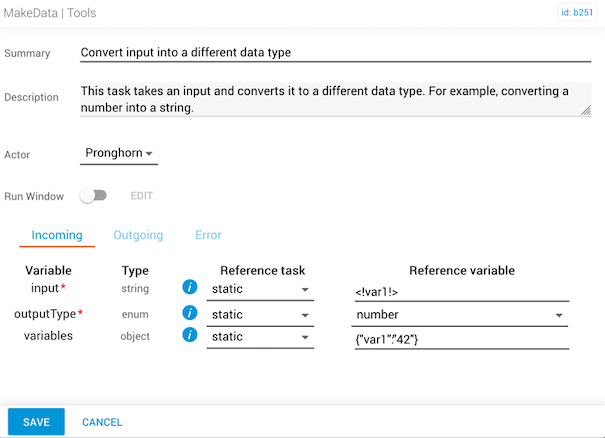 The makeData task converts an input string into a different data type. Supported output types are boolean, json, number, and string.