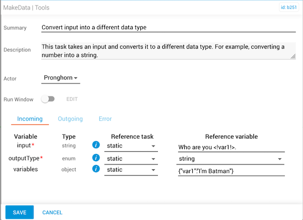 The makeData task is typically used in conjunction with a preceding task to convert incoming data into a format (type) usable by a following task. It can also be used independently, with the variables input used when converting a string that references data from a previous task. In some of the examples below, you’ll see how you can achieve the same result with or without using a variable.