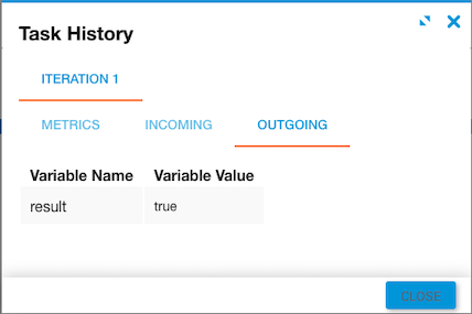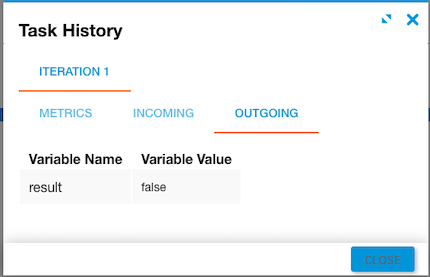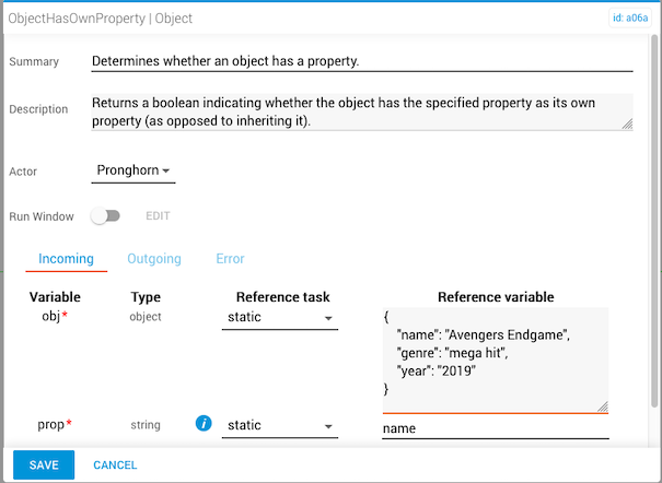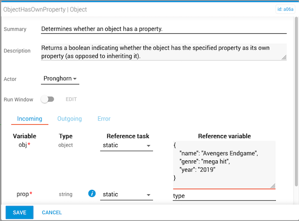 In this example, the incoming reference variable for prop is “name” and the outgoing result returns true, indicating the object contains the specified property.