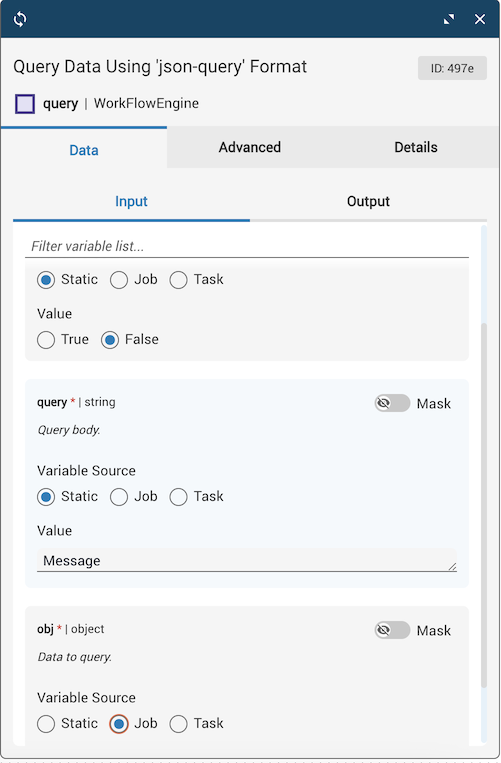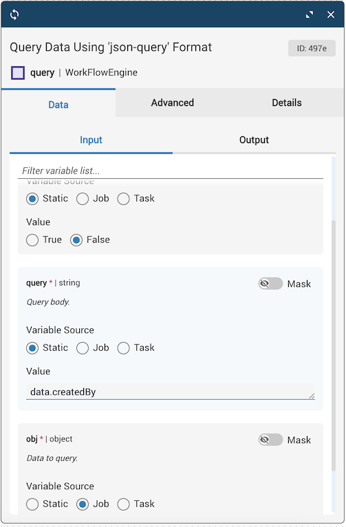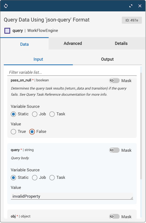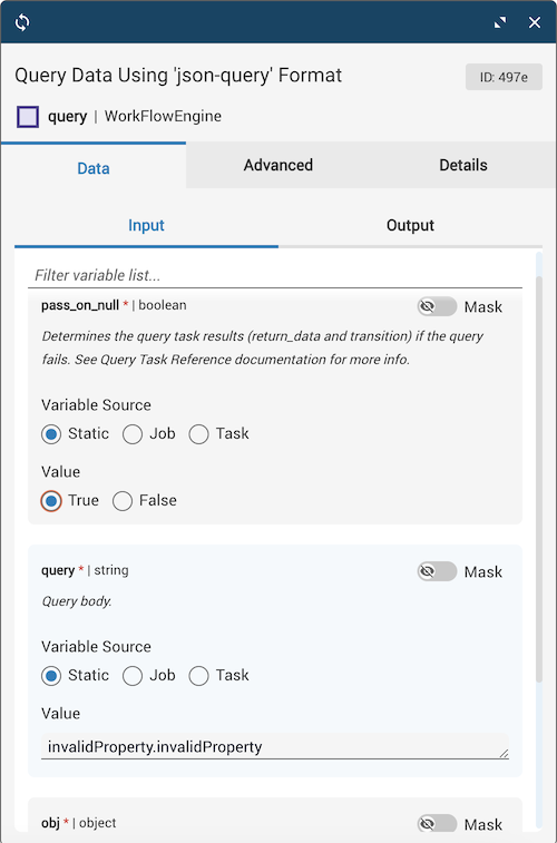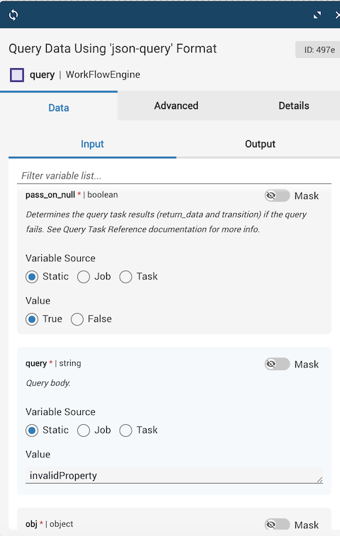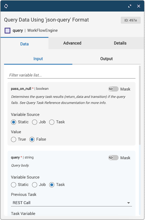 Next, double-clicking the Query task opens the task dialog to show the required input variables. The query parameter is set to search the body of the JSON in the available API, and the reference task for the obj variable is the response that returns from the REST Call task.