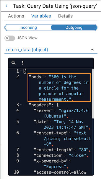 The query task extracted the nested value for createdBy (“Frank”). Other tasks can now reference this value in the workflow from the query task’s output (output.return_data).