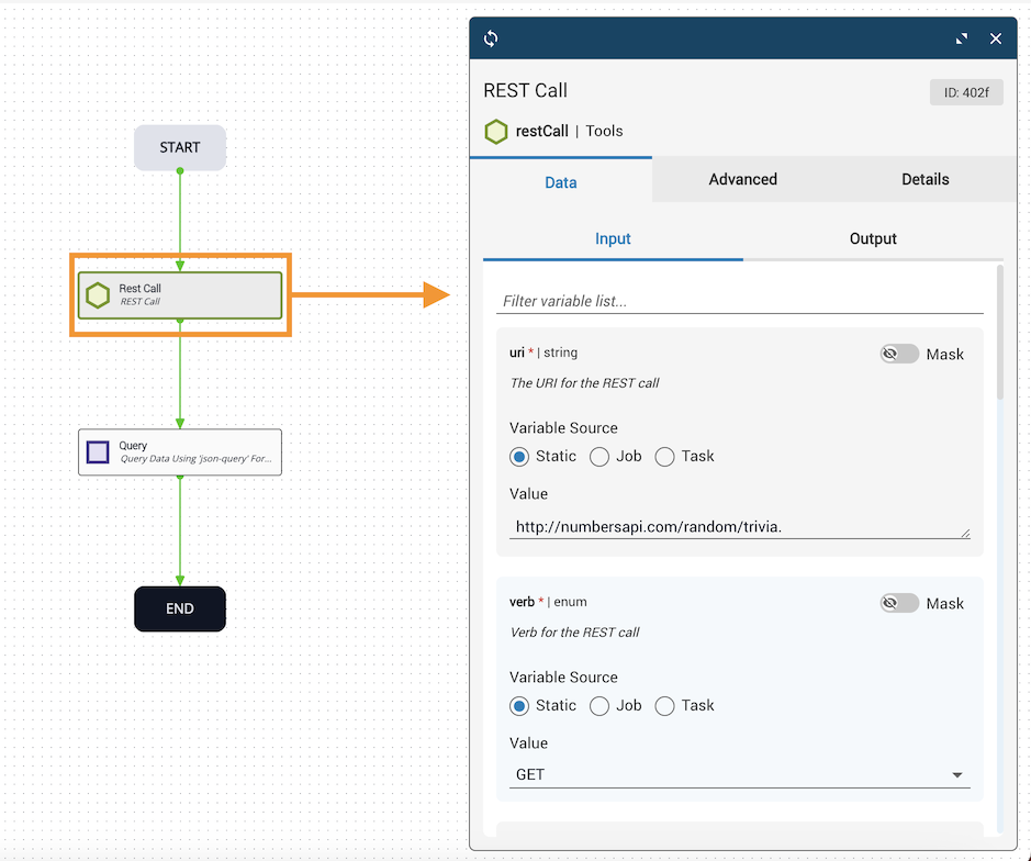 On the workflow canvas, a restCall task is set to retrieve numbers information from an available API on the web. The query task represents the data to search, which will be provided by the results of the restCall task.