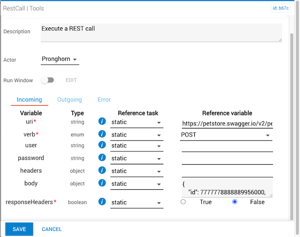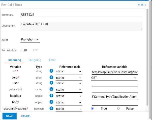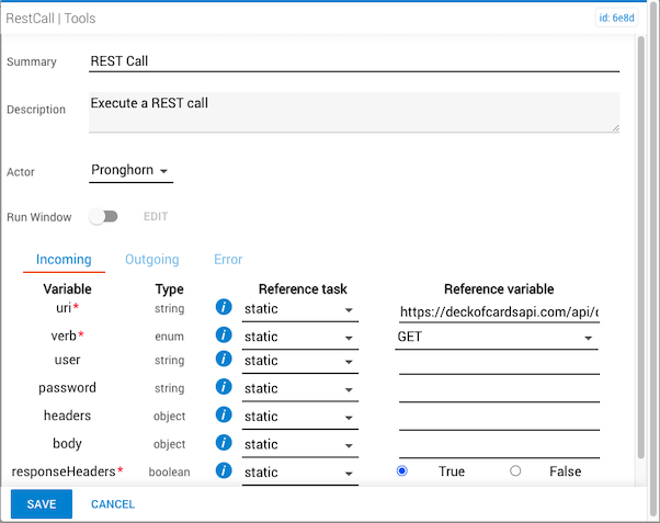 The restCall task is a powerful and flexible task for obtaining and posting data to and from external API data sources. If a specialized adapter is not available, restCall is typically the first task to consider for interacting with an external data source.