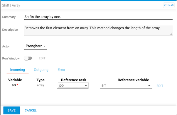 The incoming arr variable is set using the job variable arr as the data source. Optionally, you can toggle the Run Window slider to schedule the task.