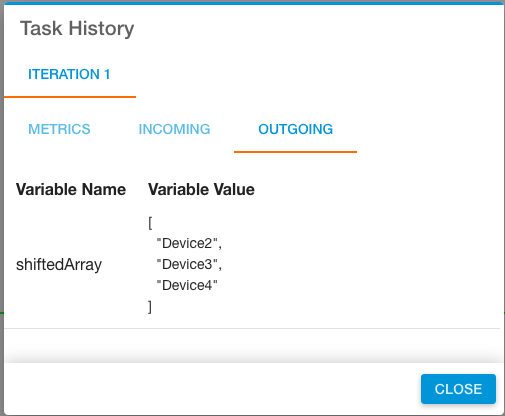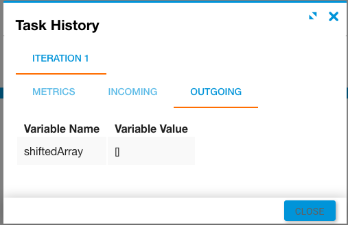 The pop (array) task has similar behavior to shift (array), but removes the last element instead of the first.