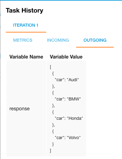 arris statically set to[{"car":"Audi"},{"car":"Volvo"},{"car":"Honda"},{"car":"BMW"}]. All names begin with uppercase letters.keyiscarandlimitis left blank.reverseisfalse(default — ascending order).