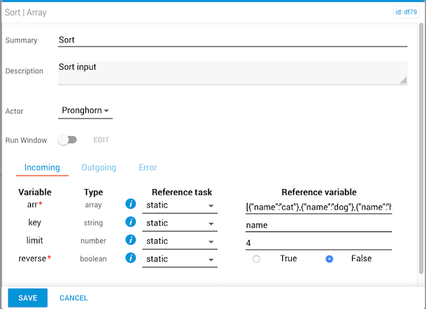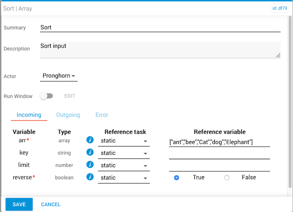 The sort task sorts the elements of a given array and returns the sorted array. The default sort order is ascending (A to Z, 0 to 9). This task modifies the position of elements in the original array.