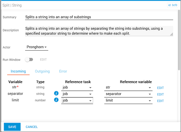 The split task splits a string into an array of substrings at each occurrence of a given separator. The original string is not changed.