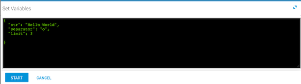 The variables are set before running the workflow. In this example, the string is "Hello World", the separator is the letter "o", and the limit is 3.
