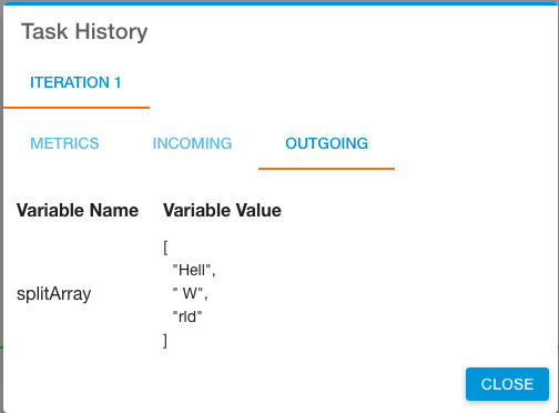 After the workflow runs, the output is visible in Task History (accessed from Jobs in Operations Manager). Three splits were made at each occurrence of "o". Note that split also recognizes and includes whitespace.