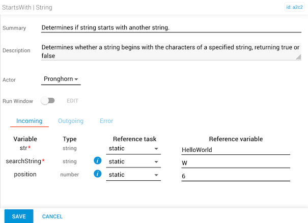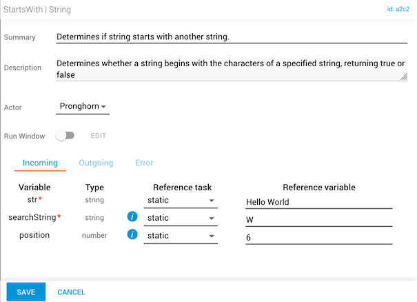 The startsWith task determines whether a string begins with another string and returns a boolean result of true or false.